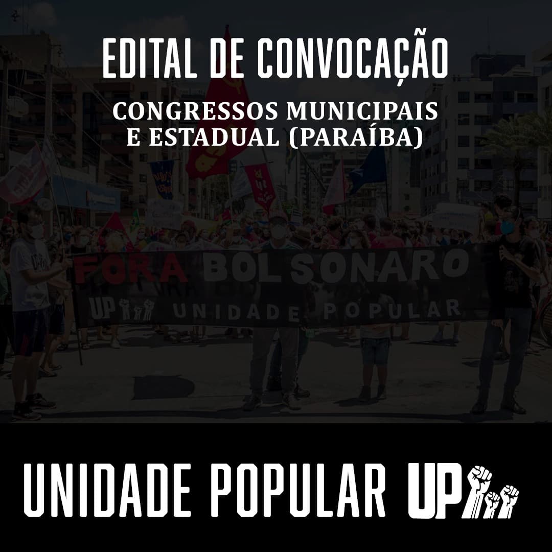 A presidenta do Diretório Estadual da Unidade Popular (UP) na Paraíba, Rosilene da Silva Santana, na forma do Estatuto do partido, convoca os filiados a comparecerem aos Congressos de seus respectivos municípios e ainda a realização do Congresso Estadual (tudo conforme pauta, calendário e local descritos abaixo), como parte da construção do 2º Congresso Nacional da UP.