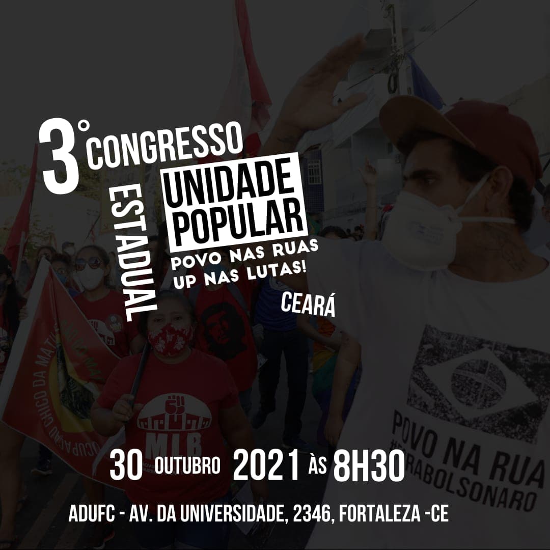 A presidenta do Diretório Estadual da Unidade Popular (UP) no Ceará, Paula Virgínia de Oliveira Nunes Colares, na forma do Estatuto do partido, convoca os filiados a comparecerem aos congressos Municipal de Fortaleza e Congresso Estadual, com a seguinte PAUTA: 1. Conjuntura; 2. Organização do partido; 3. Eleições do Diretório Municipal de Fortaleza e dos delegados ao II Congresso Nacional da UP. Local e data do congresso: ADUFC- Avenida da Universidade, 2346-Benfica, Fortaleza-CE, às 8h30, no dia 30/10.