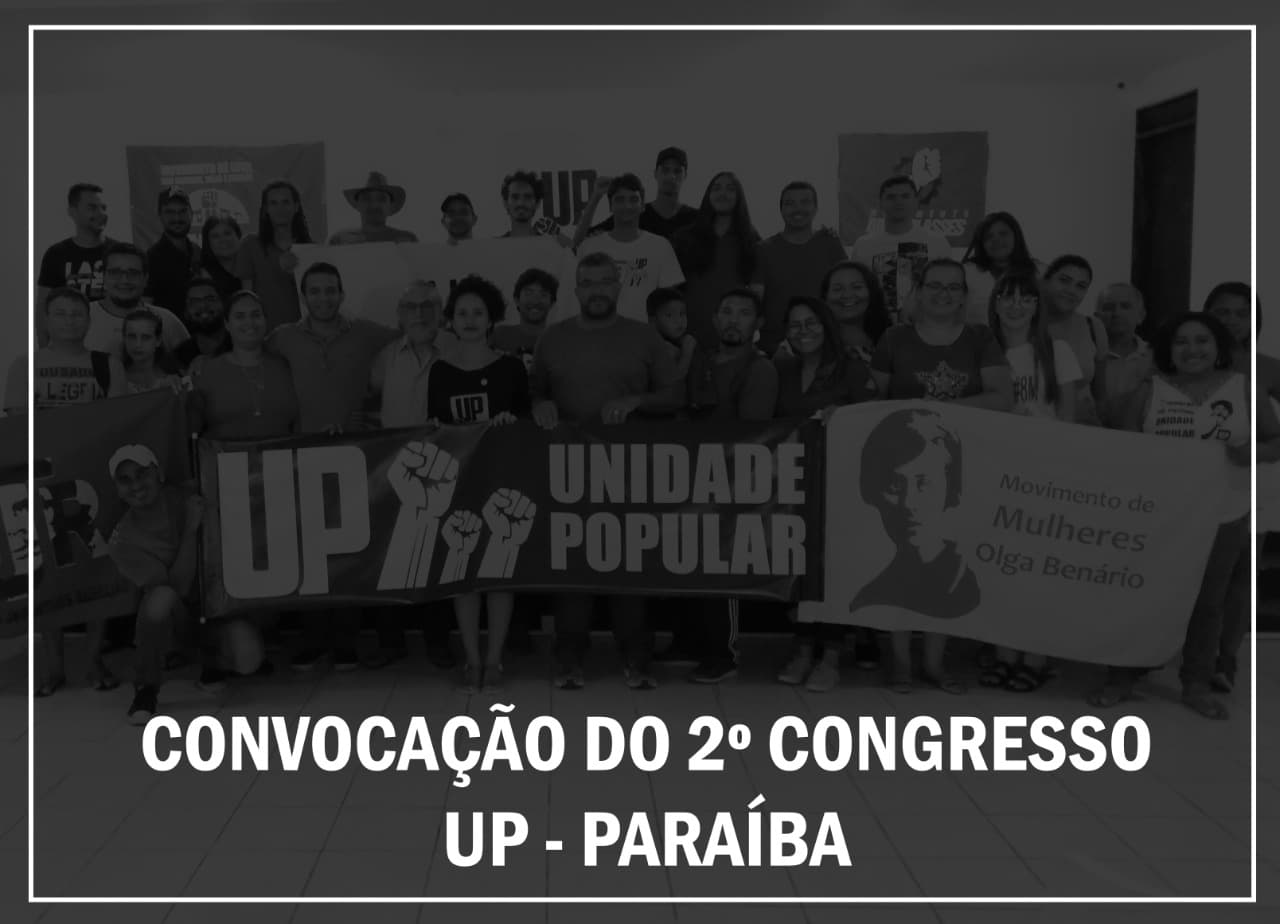 A Comissão Provisória Estadual da Unidade Popular na Paraíba, reunida em plataforma online no último dia 26 de maio, levando em consideração a necessidade inadiável de eleição da composição definitiva do Diretório Estadual e o contexto de pandemia que assola nosso país, deliberou pela convocação do 2º Congresso Estadual do partido.